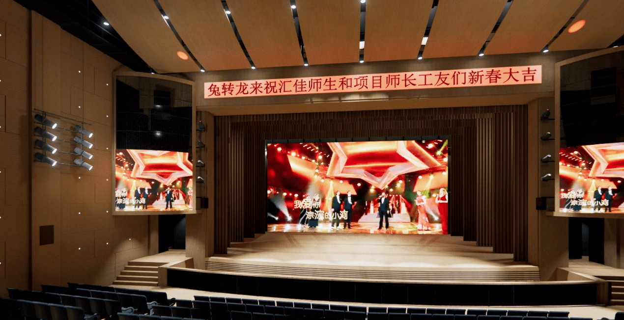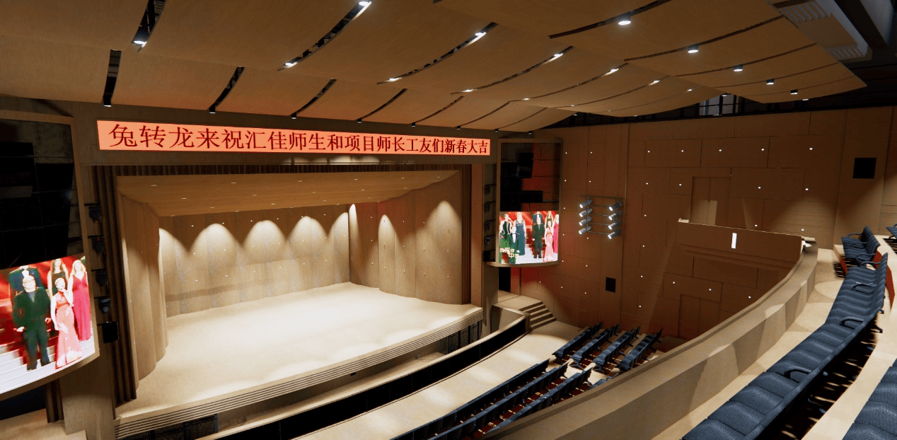 The stage acoustic cover is not only coordinated with the stage, but also the overall appearance and lighting are also unified with the audience hall to achieve a perfect overall effect.