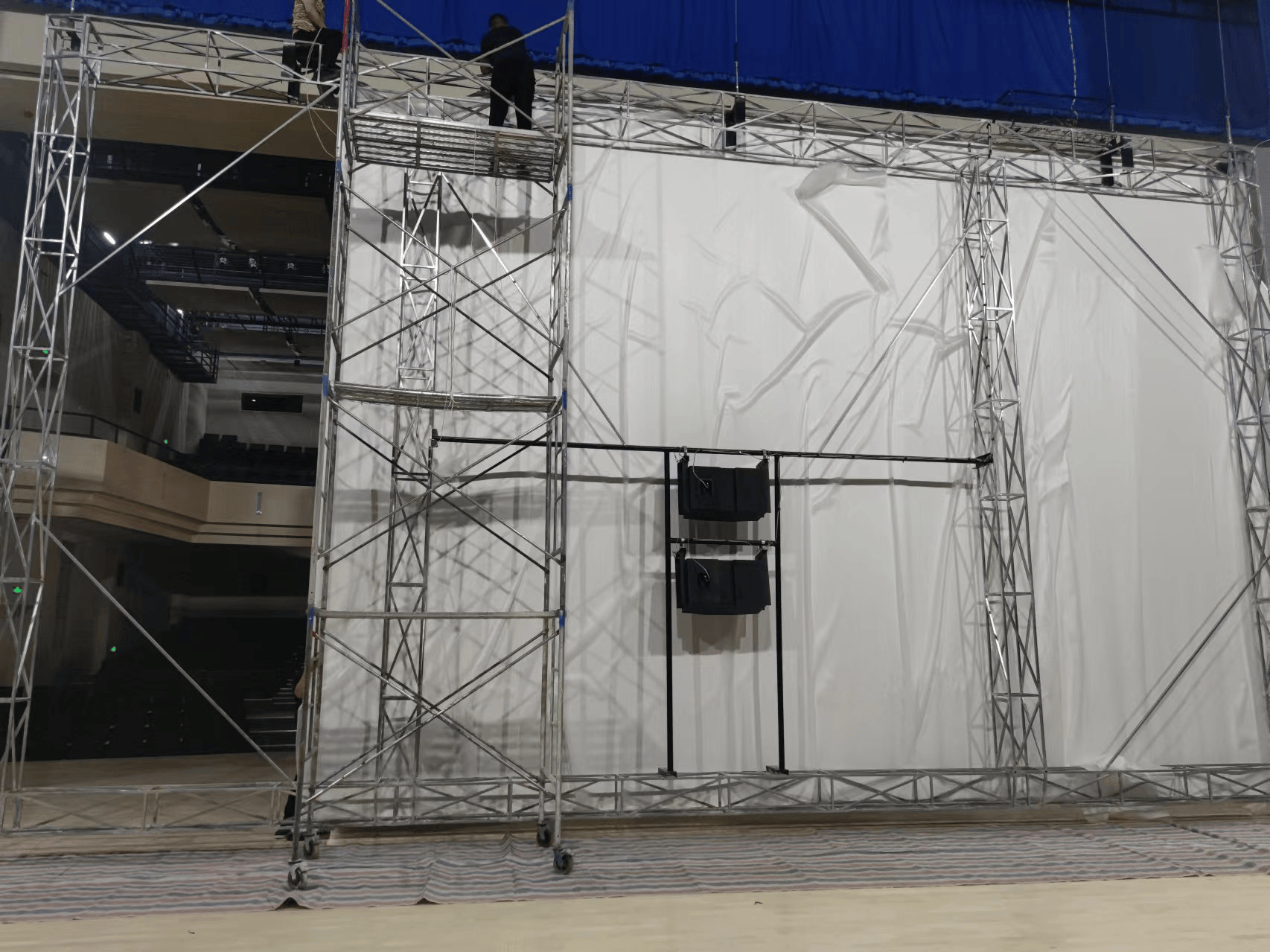 Two curved ear rooms are made of steel structure at both ends of the stage, the upper half is placed with a line array and a subwoofer, and the lower half is made of two curved LED auxiliary screens. There is an electric frame that can be automatically stretched out on the side of the ear room by the stage mouth, which can be installed with 4 pairs of computer lights and 1 pair of monitors, which are matched with 2 monitors on the table, compared with the monitors placed on the table, to avoid reflection distortion, and at the same time, the sound is emitted from above, making the actors more passionate.